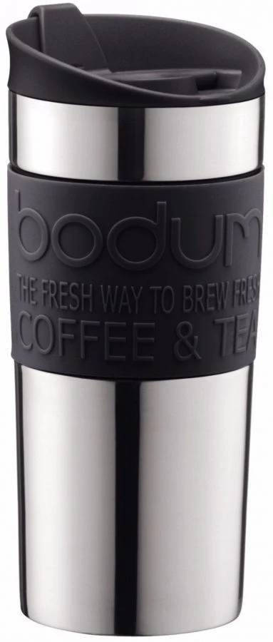 The Bodum travel mug is vacuum and made from stainless steel for maximum heat retention. It has a a closable lid with a stopper for the opening and a slip-proof silicone band.