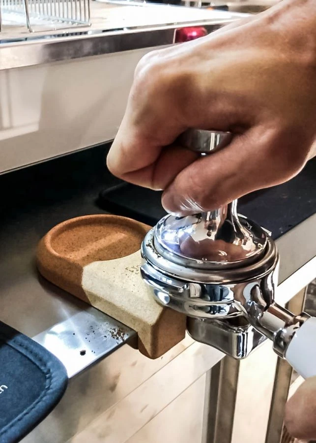 This JoeFrex Corner Mat tamper rest is made of upcycled cork, based on the idea of a more ecological product. Not dishwasher safe.