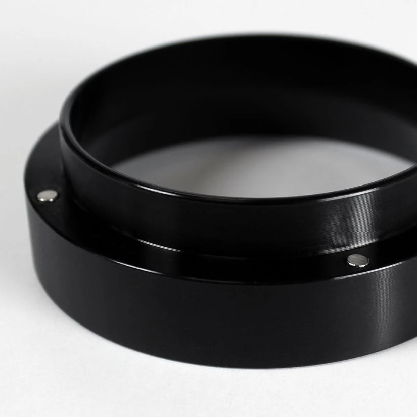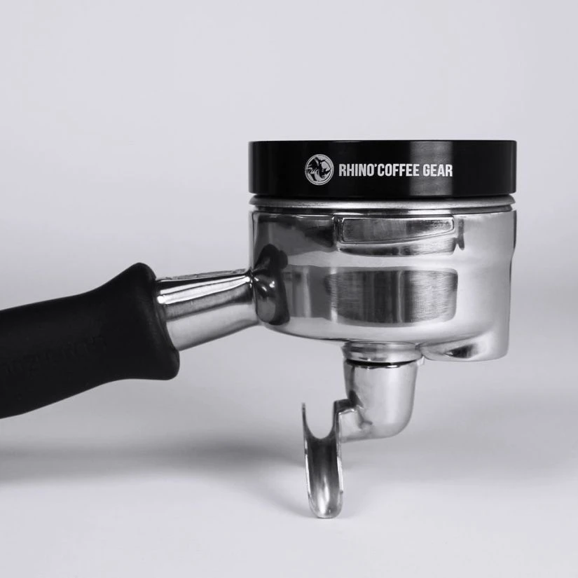 The Rhino Coffee Gear dosing funnel tool helps you guide messy coffee grounds directly into your portafilter basket. Magnets keep the funnel perfectly in place.